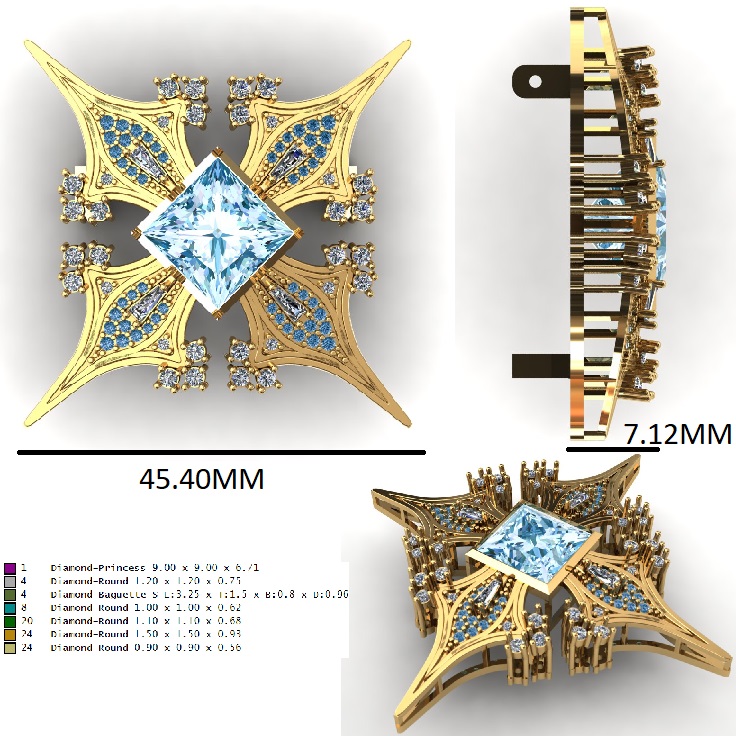 This elegant blue gemstone brooch CAD design features a luxurious floral-inspired structure centered around a vibrant blue gemstone. The central stone is framed by a halo of sparkling round diamonds that enhance brilliance and visual depth.