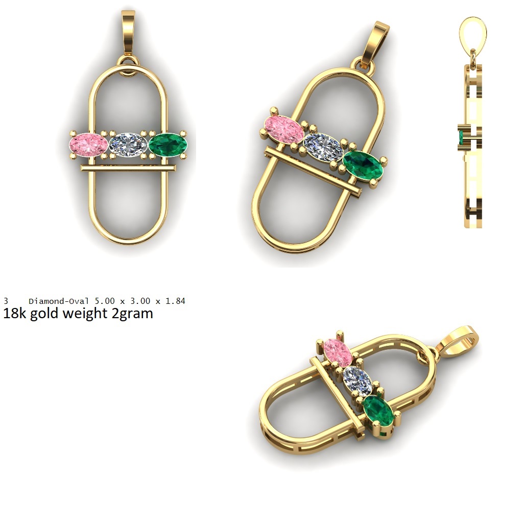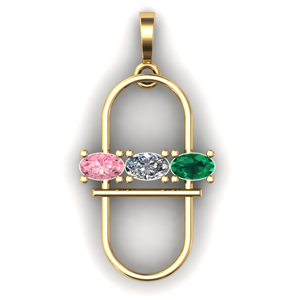 A sleek and modern three-stone gemstone pendant CAD design featuring a clean oval frame structure and a horizontal gemstone bar centerpiece. The pendant showcases three oval-cut gemstones set side-by-side in secure prong settings, creating a balanced and elegant composition.